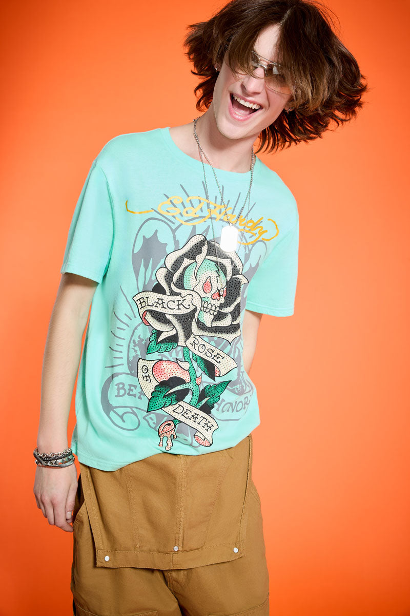 This rhinestone adorned t-shirt is cut in a regular fit and constructed from a soft cotton blend. Complete with a Black Rose graphic and two archival Ed Hardy logos.