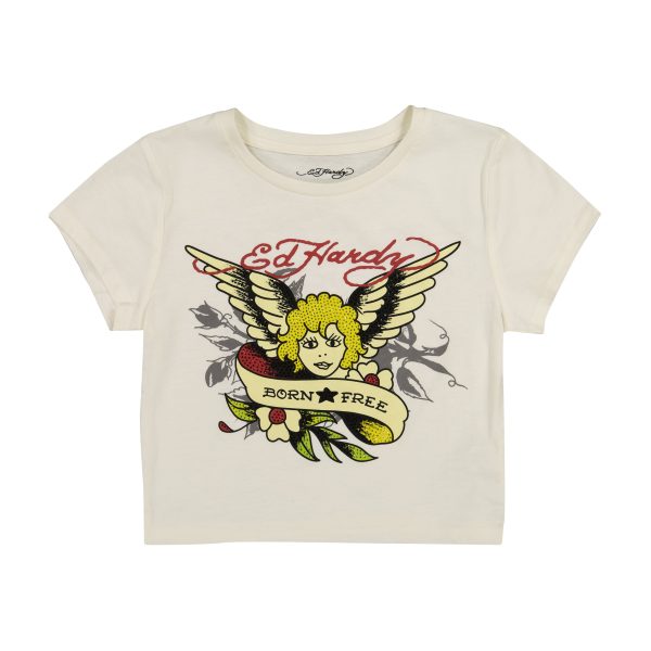 Our classic baby tee silhouette featuring an archival cherub graphic and red Ed Hardy logos. Constructed from a soft cotton blend.