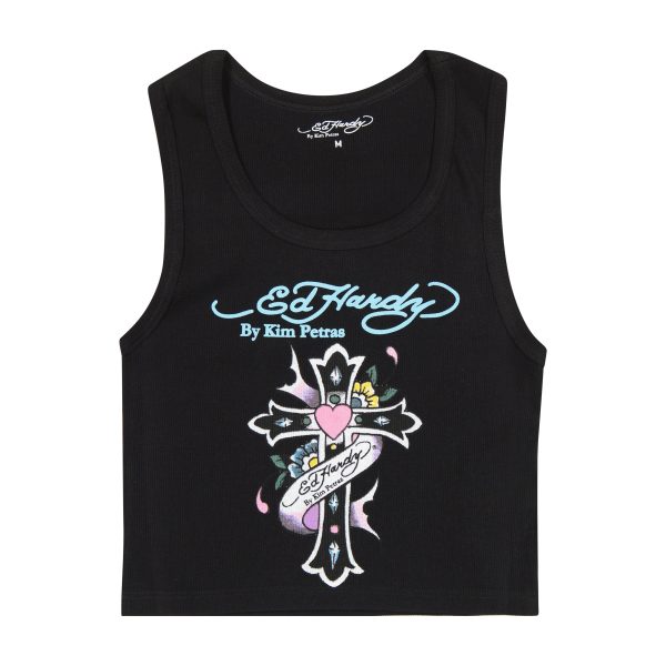 Cropped ribbed tank top constructed from 100% cotton. Features a cross heart graphic and an Ed Hardy by Kim Petras logo.