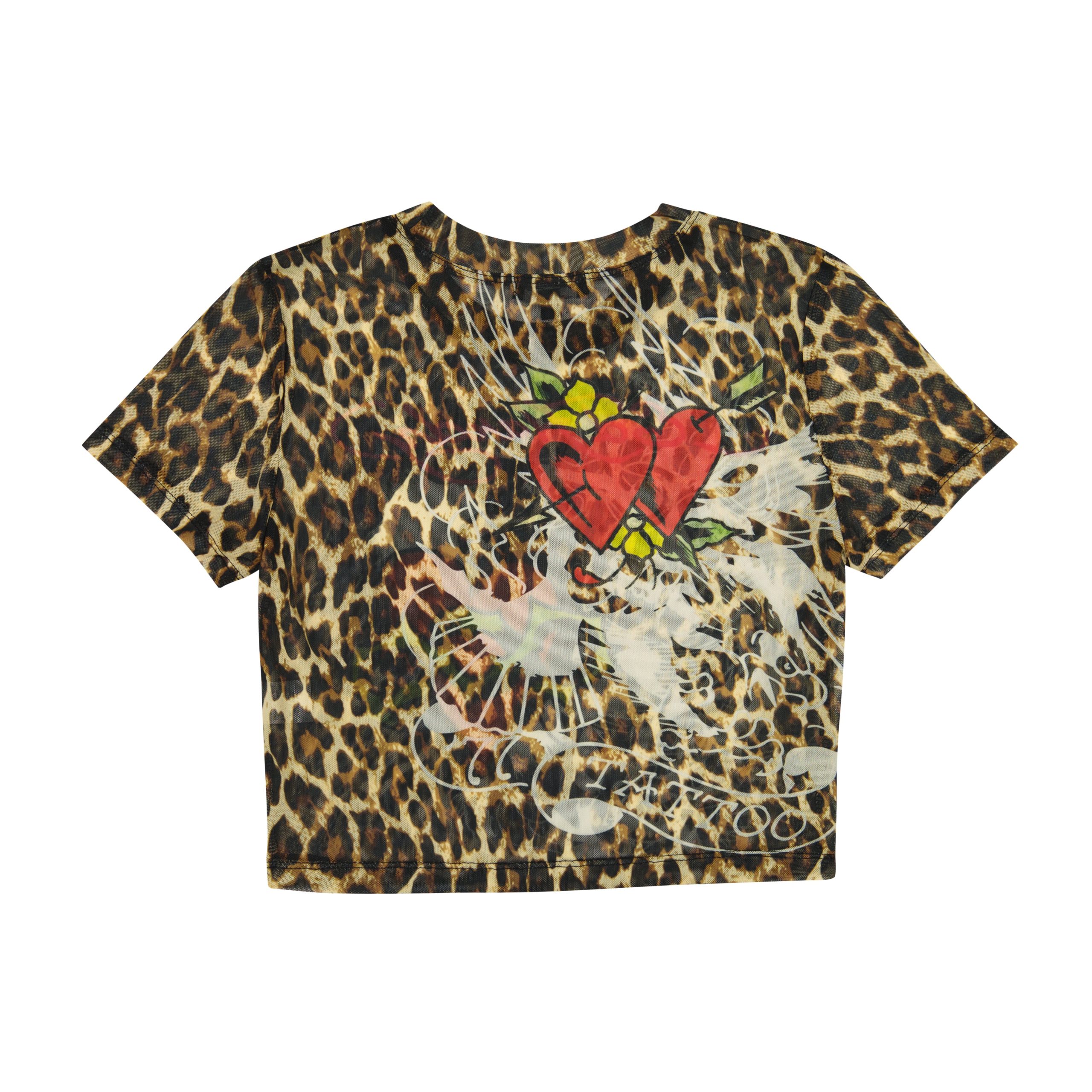 Signature baby tee silhouette cut from a power mesh in a leopard print. Features layers of archival Ed Hardy artwork and logos.