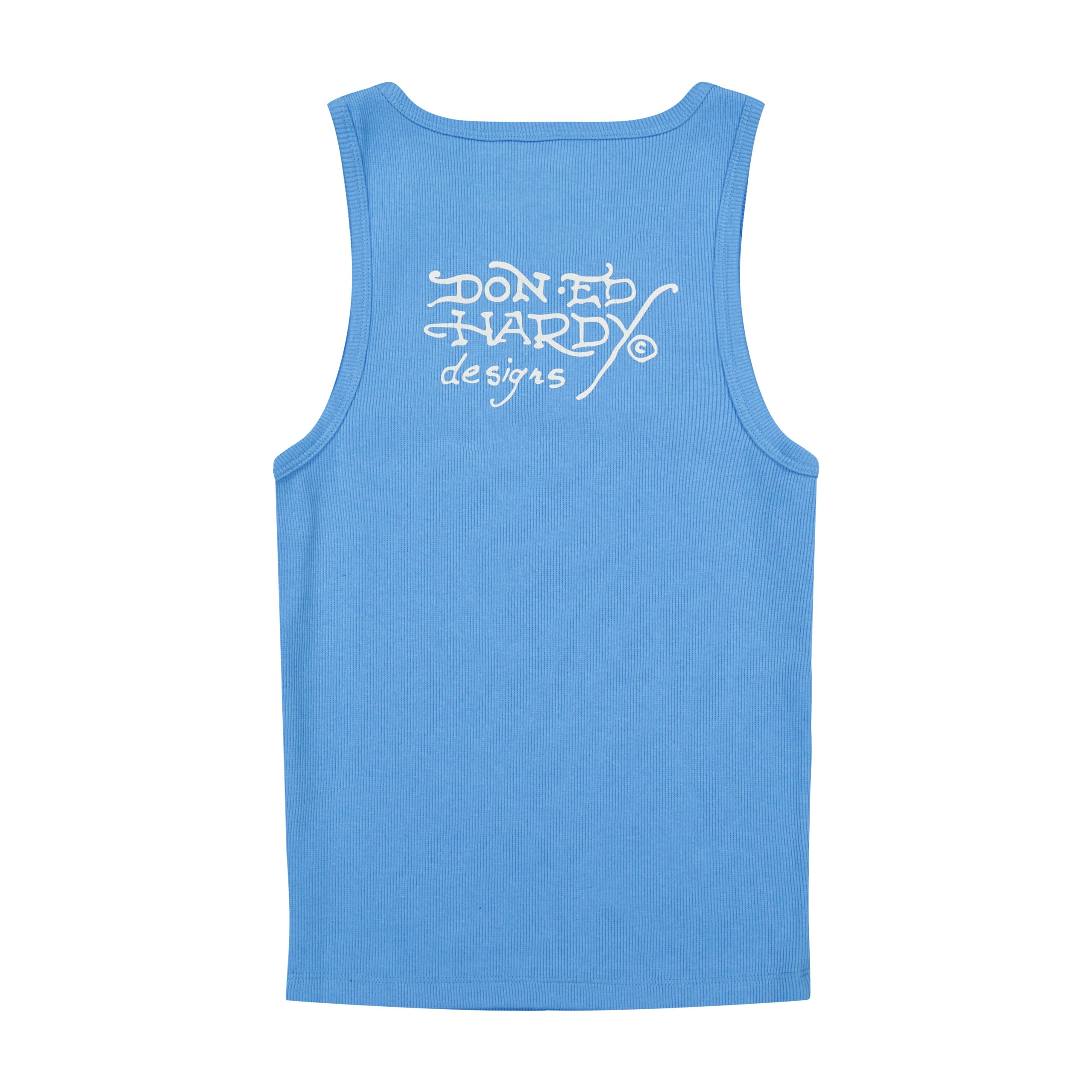 Slim fit tank top cut from a rib knit in powder blue. Features a signature Ed Hardy swallow graphic and multiple archival logos.