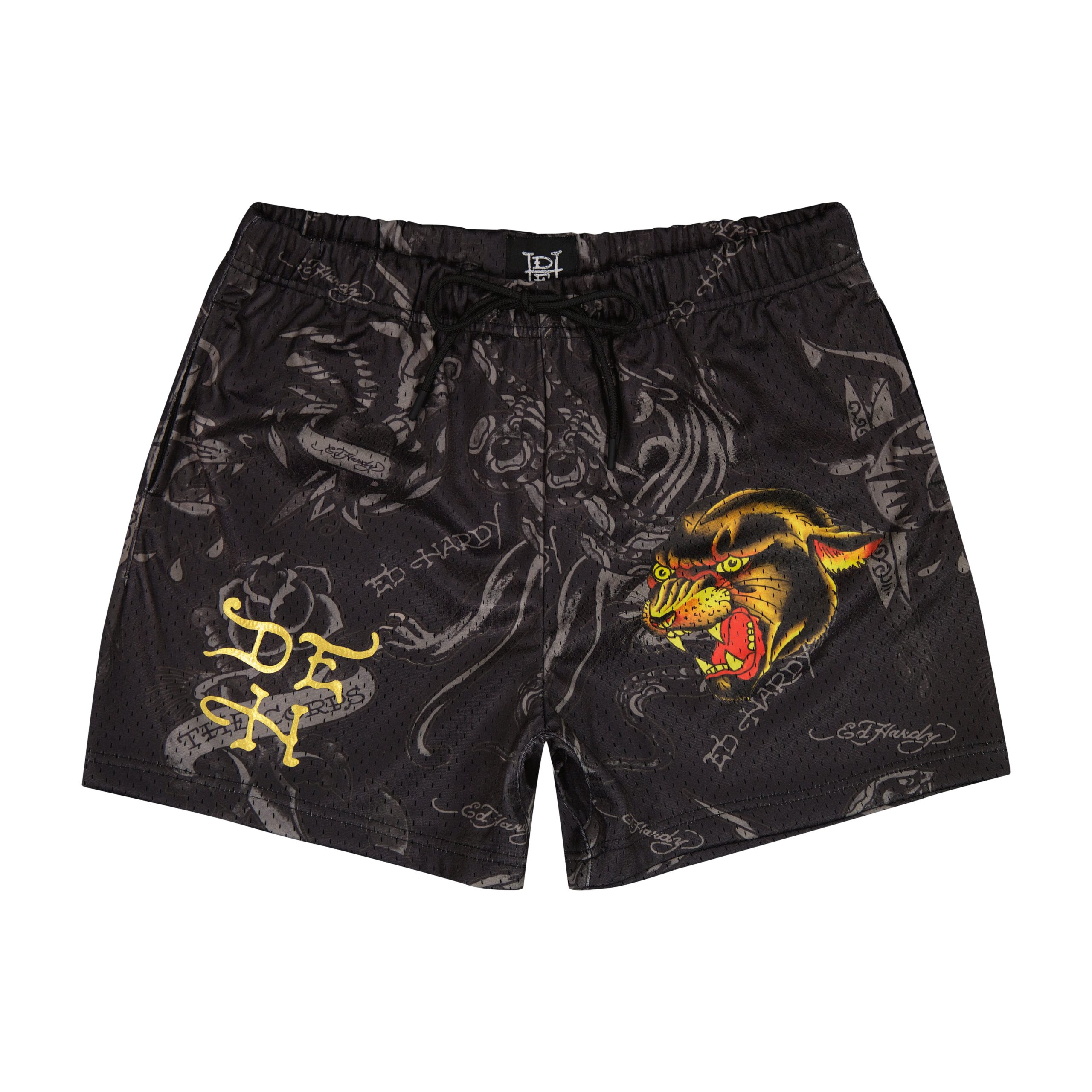 Classic basketball short silhouette cut from a double ply mesh. Features three pockets and an adjustable drawstring. Includes an archival panther graphic layered over an allover tattoo print. Complete with a signature Don Ed Hardy logo in gold.