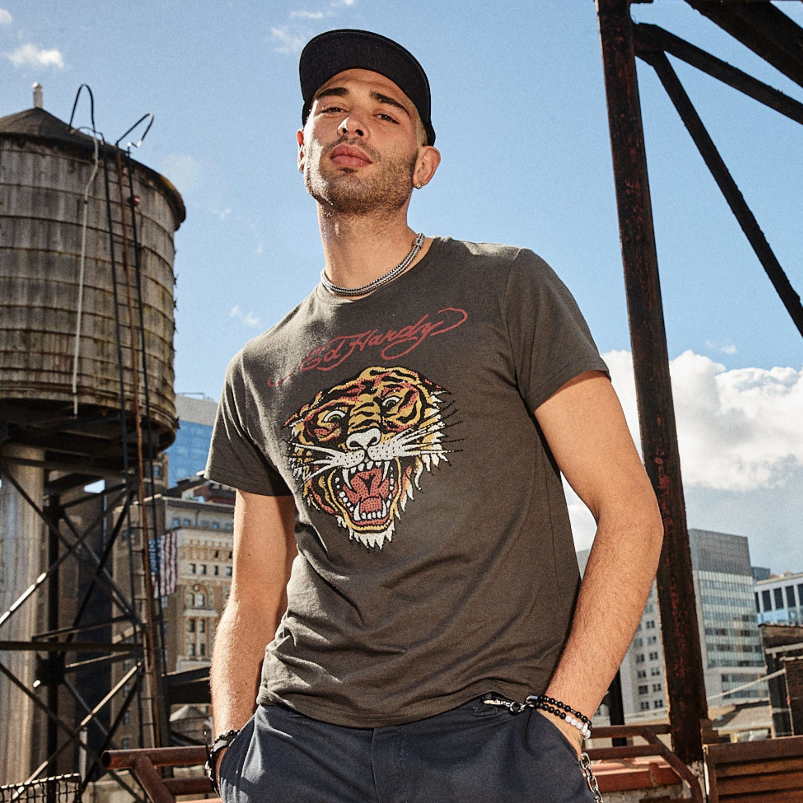 This charcoal tee is constructed from quality cotton to ensure comfort. Complete with rhinestones and the signature Ed Hardy tiger head graphic.