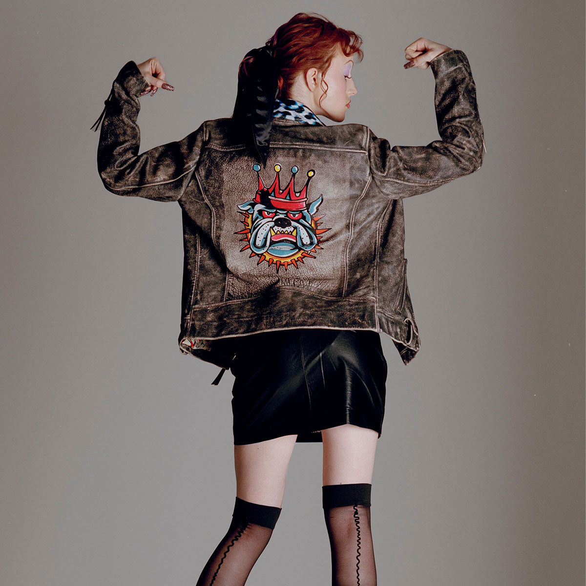 This Mae X Ed Hardy Showgirl skirt is made with luxury faux leather featuring a pink custom printed inside lining and Mae’s signature beaded logo chain along back V cut out.