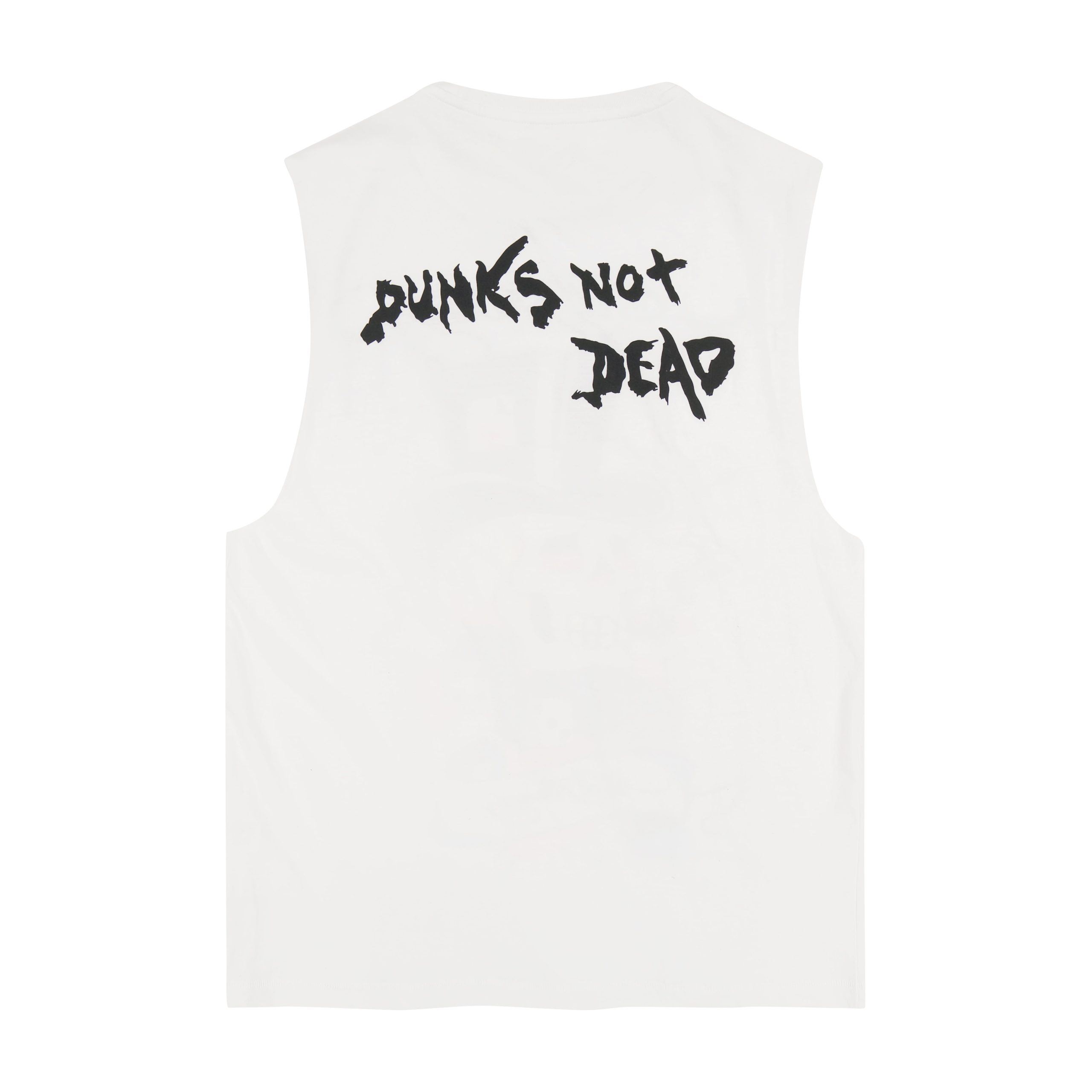 This cotton blend cut off tee features archival skull tophat and punks not dead graphics. as well as a black logo.